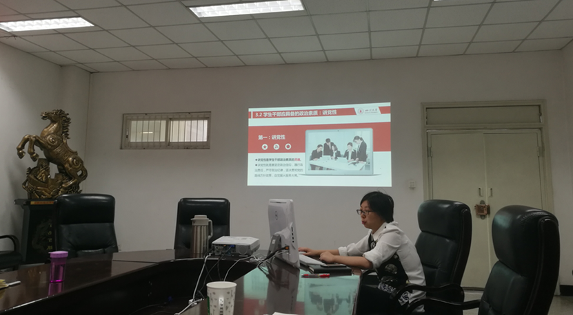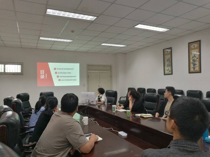 2018年4月24日上午10点,学院学生工作组在学院A220会议室召开了以“网络时代下党员学生干部思想政治再教育”为主题的专题研讨会。学院党委副书记戴婷婷及全体辅导员老师参加了本次研讨会,2017级硕士研究生辅导员于孜清老师做主题发言。