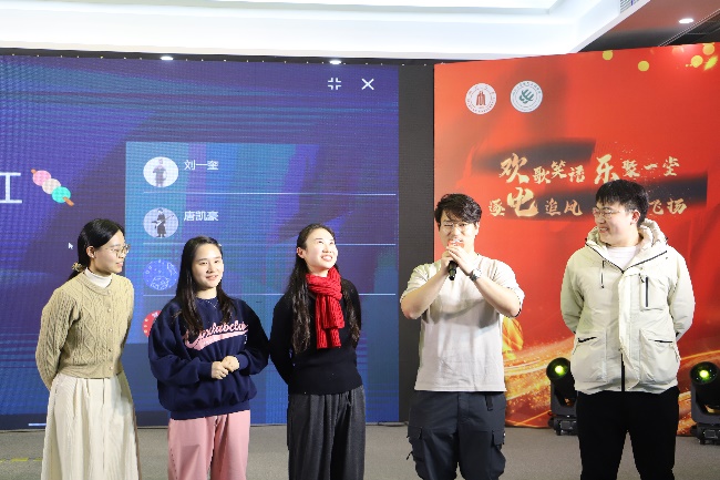 联欢会上,互动游戏妙趣横生,新进教职工自我介绍接力增进交流,抽奖环节激动人心,整场联欢会气氛活跃热烈,现场掌声阵阵,欢声笑语不断。