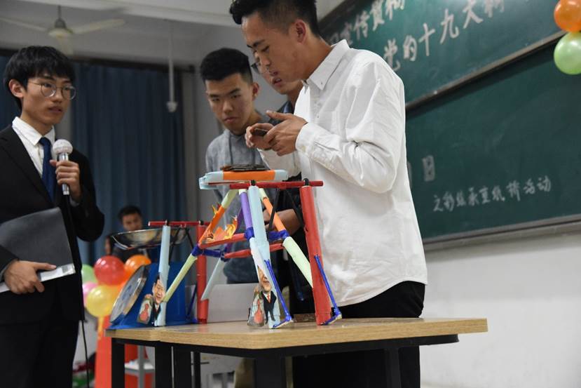 各支部依次对本支部一周内悉心完成的承重纸桥作品进行展示与介绍,并按要求放置铁块测试其承重能力,作品由嘉宾与各支部评委进行民主投票与打分。各支部作品造型美观,结构精妙,展现出不俗的承重能力,彰显出团队的创新能力与凝聚力。比赛中场的暖场游戏与十九大知识有奖问答调动了现场观众的积极性,加深了同学们对十九大治国理政方针的认识,大家纷纷表示受益匪浅。