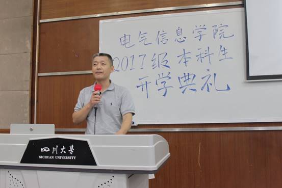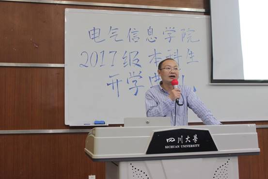 电气信息学院院长助理、博士生导师肖先勇教授作为教师代表发言。他汇总归纳了我校校长谢和平院士六年以来的新生寄语,从历史文化、科研水平、教学条件、领域成果等方面概述了我院的辉煌过去与发展机遇,引导同学们学会自我管理、修炼专注精神、明确个人目标,成就最有价值的人生。