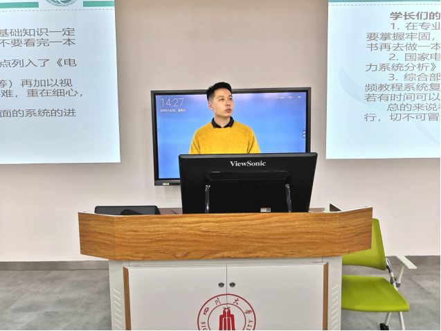 2019年10月26日下午2点,四川大学永利集团3044am2019年国网统一考试经验交流会在望江校区基础教学楼C座101教室顺利举行。交流会由学院学生科副科长胡劼老师主持,邀请了学院2019届级毕业生刘春法分享考试经验。学院有意愿参加今年国网统一考试的本科生、研究生参与了此次交流会。