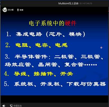 下午三点整,李小根老师准时开始了本次特色讲座的讲解。李小根老师首先全方位的介绍了Multisim仿真软件,包括软件版本问题,安装卸载等问题,为同学们的使用扫明了误区。随后,李老师对Multisim的基本器件进行了介绍,以帮助同学们更快更准的找到相应所需的器件,进行实验。李老师还详细的介绍了电路分析的核心定理,如何看懂电子的系统图,并指出电路实验中一些常见的错误,以及一些器件特殊的性质,帮助同学们更好的实验。接着,李老师向大家介绍了Multisim的具体操作,包括工程的建立,电阻电源的引用等,以及在软件中如何进行一系列的电路测试。