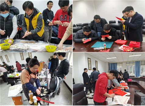 在春节序曲欢乐的音乐中,拉开了活动的序幕。老师们有的开始挥毫舞墨写春联,也有心灵手巧的老师开始剪窗花,还有的老师帮忙拌馅、和面、擀皮准备着大家的饺子宴。