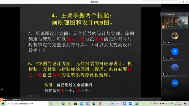 培训讲座根据大学生参加电子竞赛和双创活动由3人协同组合的特点,分为“硬件员”、“软件员”、“设计员”的三个分工模式进行。在前两次培训会上,李老师为同学们讲解了硬件员利用现代软件进行电路原理图和印刷电路图的设计技能入门与提高的技巧;讲授了计算机辅助电子设计仿真软件 Multi SIM在设计员训练中的应用;介绍了软件员的生涯规划和培训计划,从软件员在“三大员”中的作用、电子大赛与双创活动当中的地位等,结合智能车项目鼓励同学们专注编程,努力学习。李老师还按照“控制类模块、单片机的编程语言、单片机与外围模块、控制模块的常见外设、常用数字化传感器模块”等五个方面为同学们进行了详细的介绍,并就之前布置的作业题目进行了认真细心的讲解。第三次培训会上,李老师重点讲解了电子技术元件的知识点、电子元件的“工程图”参数表示方法、电子元件的“元件实物”参数表示方法、焊接工艺、拖焊技术等,并以视频直播的方式进行实践操作演示,进一步加深同学们的了解。