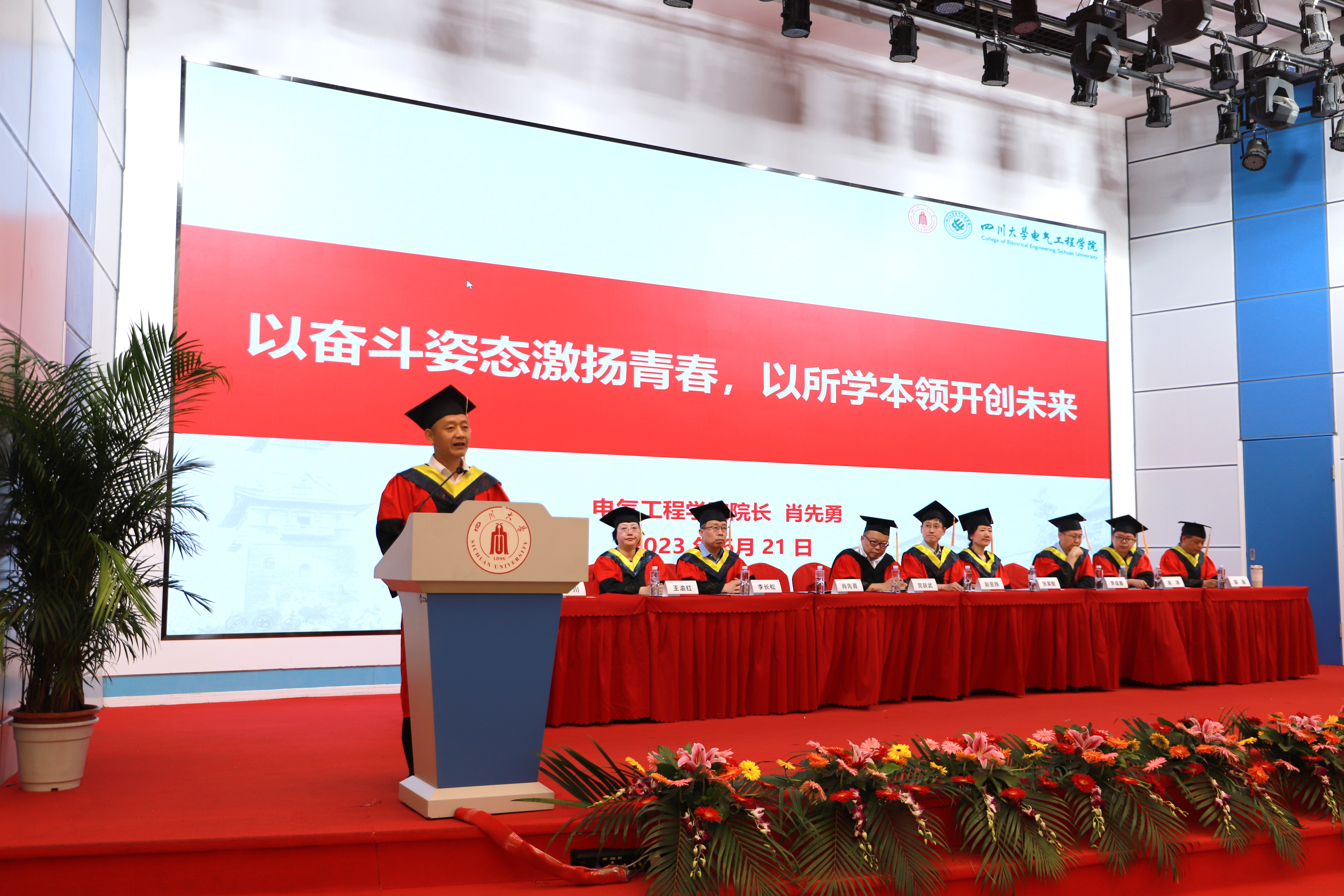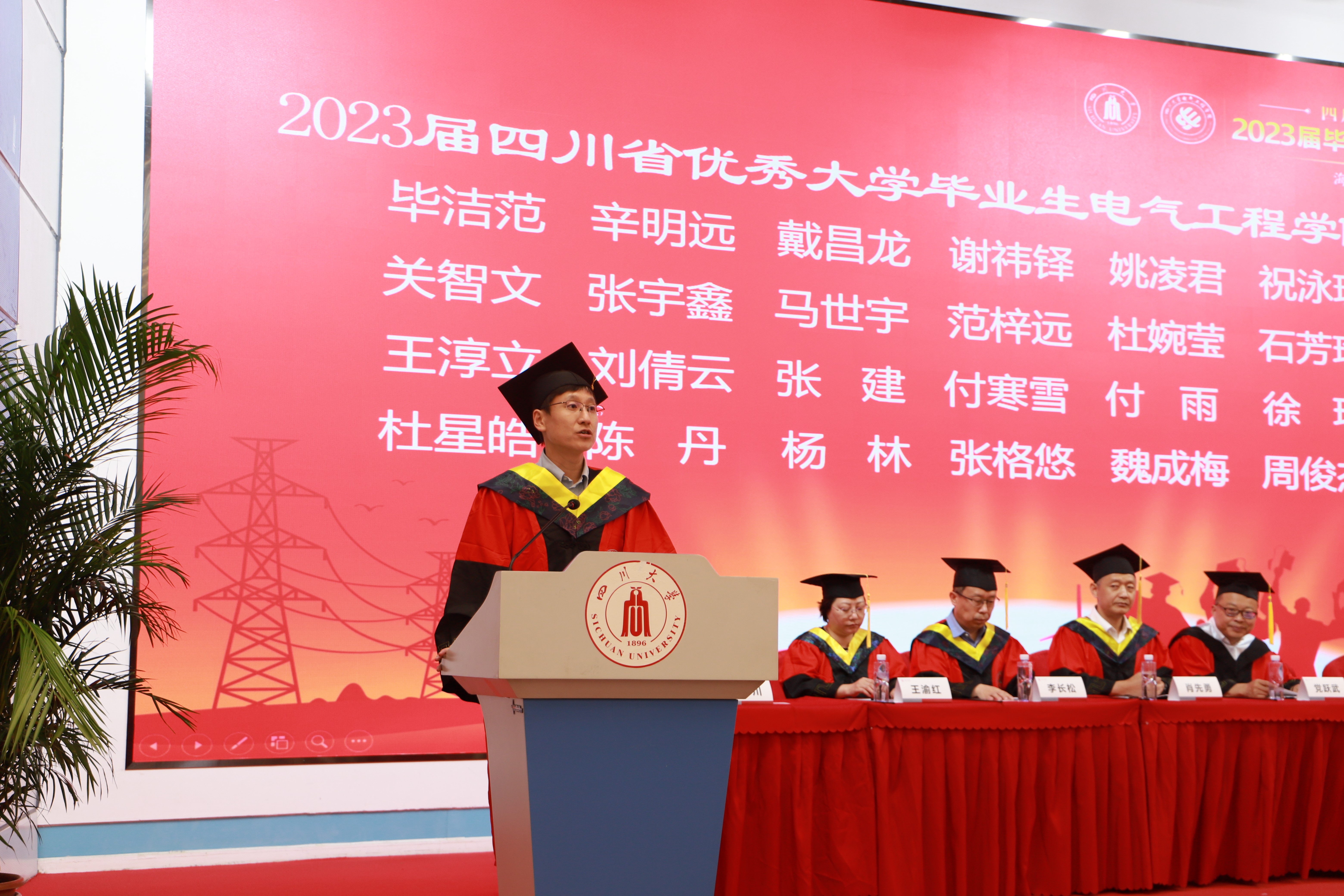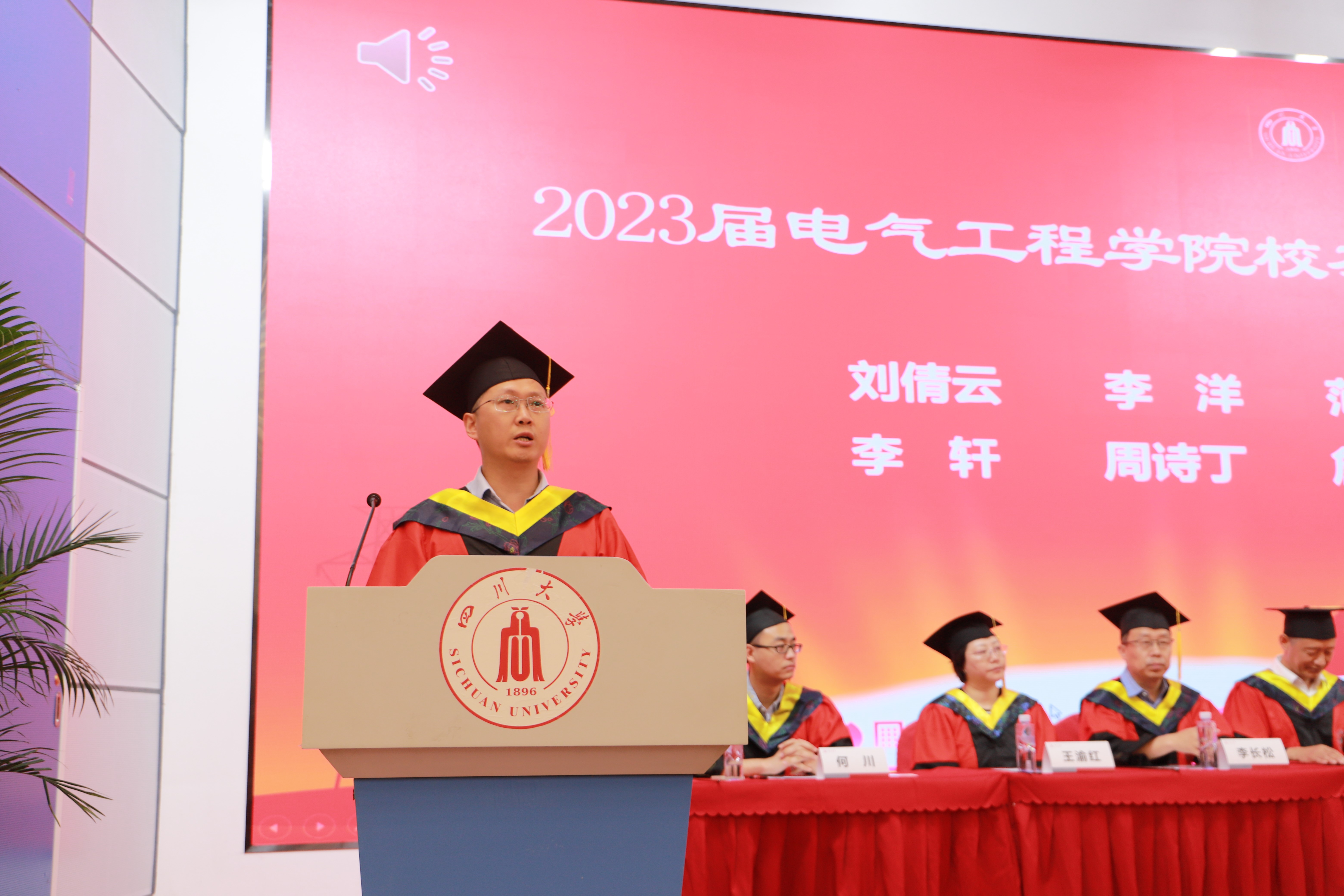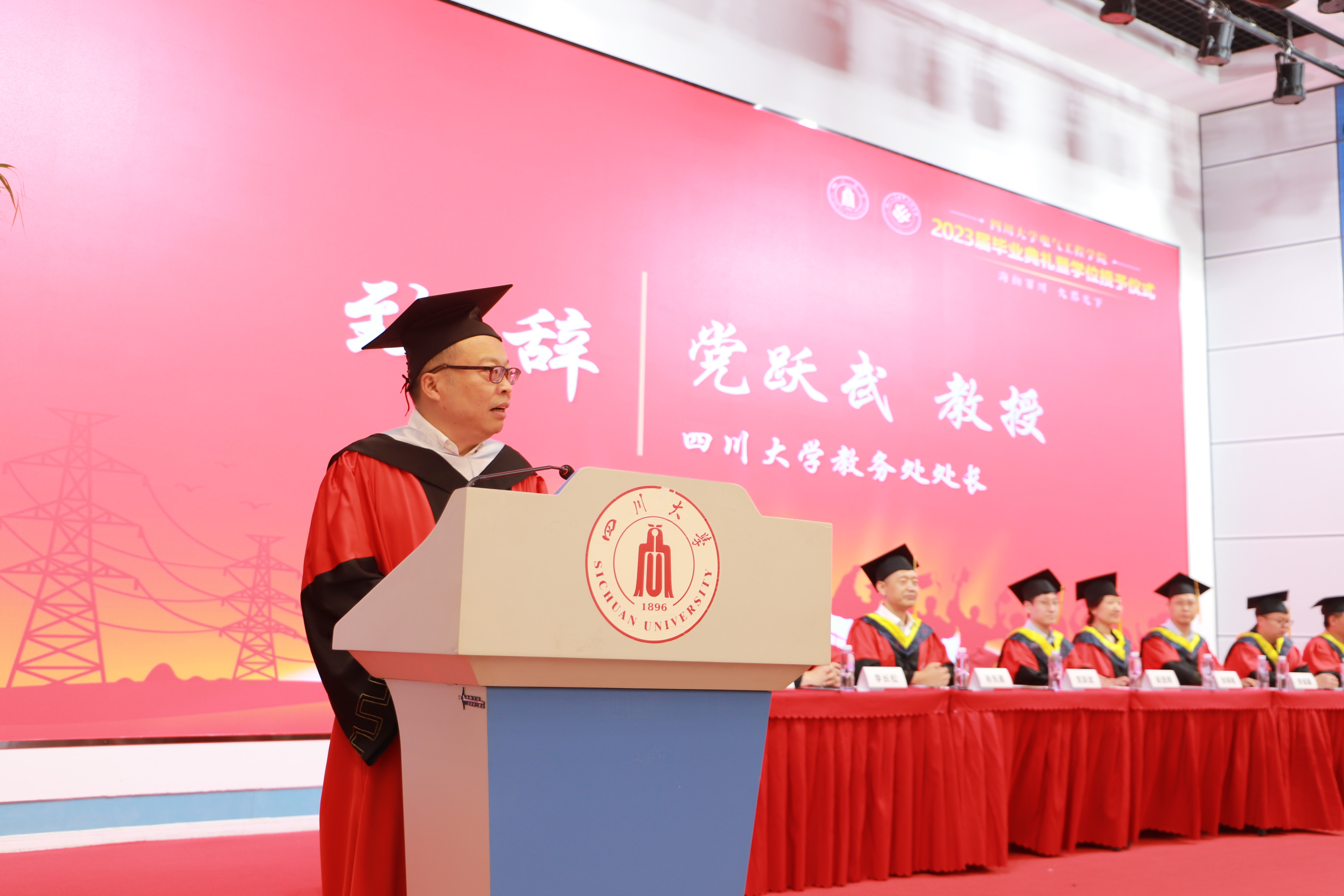 学校教务处处长党跃武发表致辞。他首先向2023届永利集团3044am的全体毕业生顺利完成学业、走上新的人生征程表示祝贺。他以川大老校长任鸿隽先生1937年毕业典礼训词中“忠于所学”“有所不为”“继续求学”三句话来勉励同学。他说,忠于所学就是要有心怀国之大者的光荣使命,有所不为就是要有以人民为中心的价值准则,继续求学就是要有把本领学到手的成才境界。他希望每位电气毕业生都要把川大的精神带出去,把川大的味道留身上,奔向五湖四海,融入星辰大海。在新时代的新征程上,一起努力奋进,一起爱党爱国爱川大,永远为伟大祖国雄起,永远为四川大学扎起,地负海涵,直挂云帆!