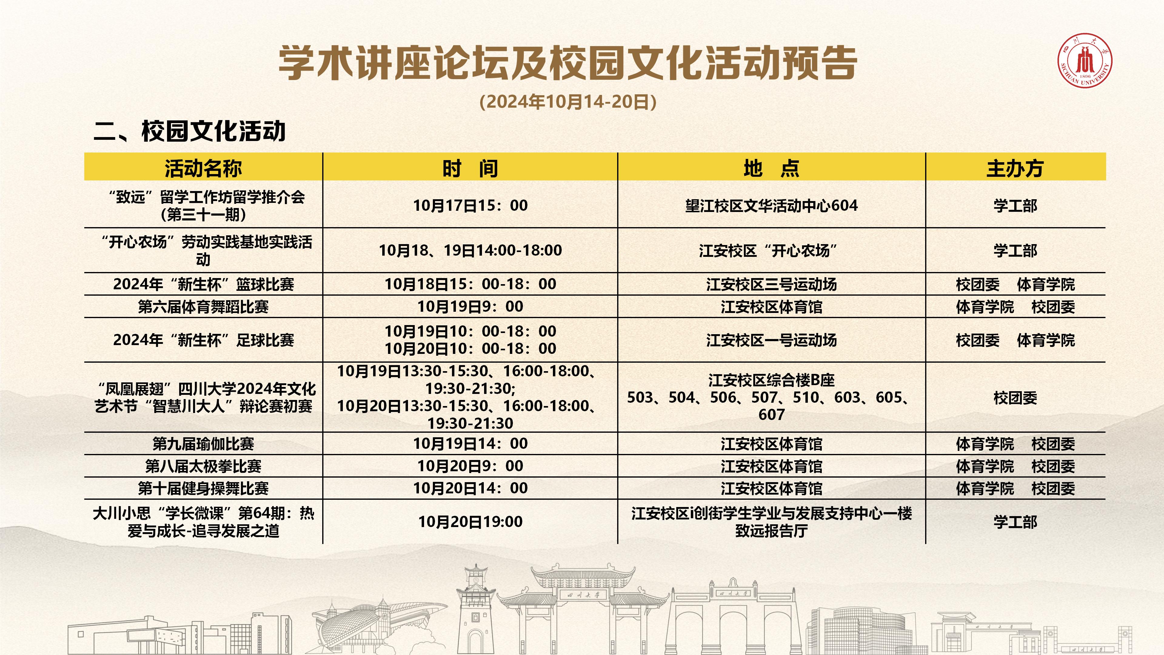四川大学2024年10月14日-20日学术讲座论坛及校园文化活动预告