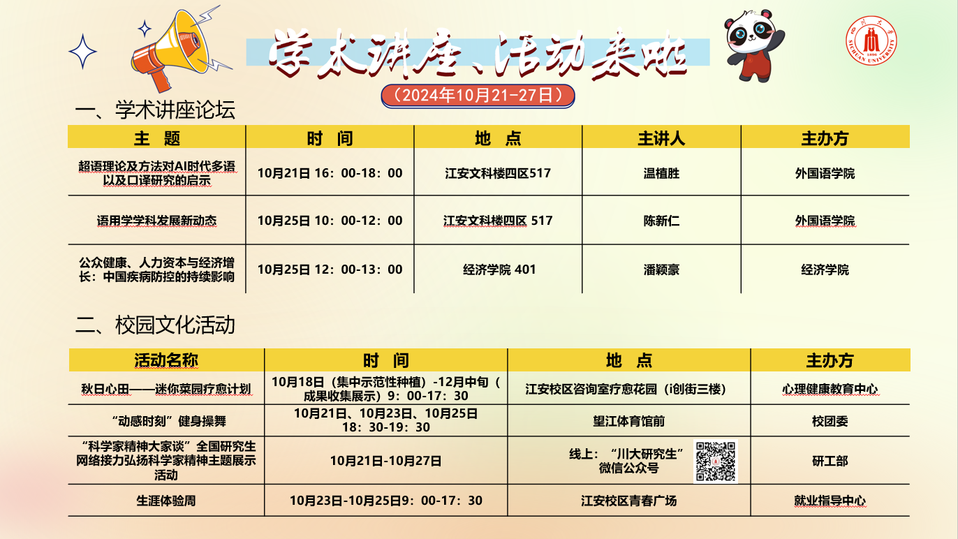 学术讲座论坛及校园文化活动预告(2024年10月21-27日)