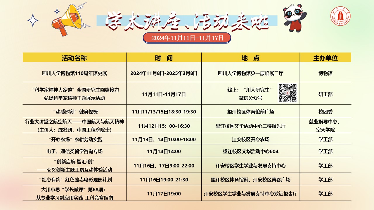 学术讲座论坛及校园文化活动预告(2024年11月11-17日)