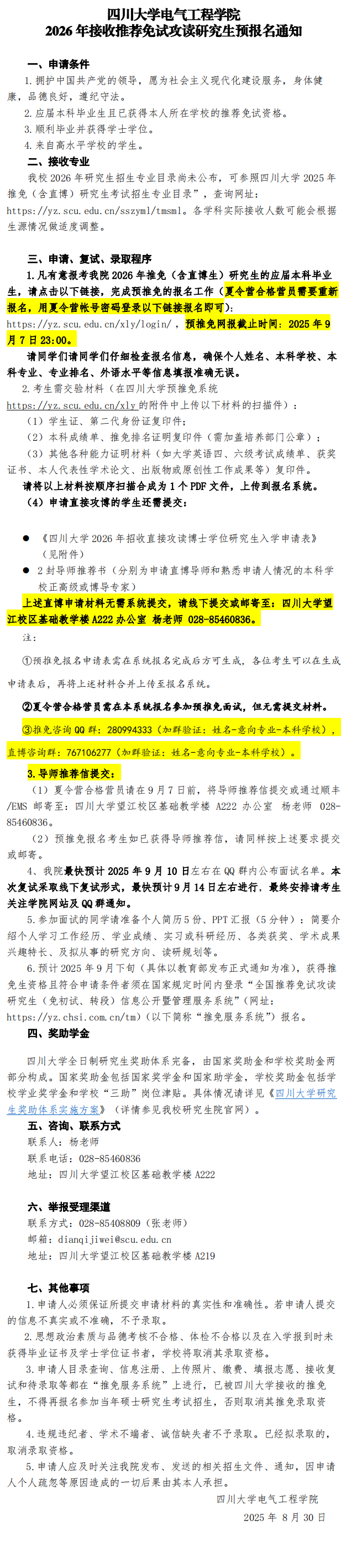 四川大学永利集团3044am2026年接收推荐免试攻读研究生预报名通知