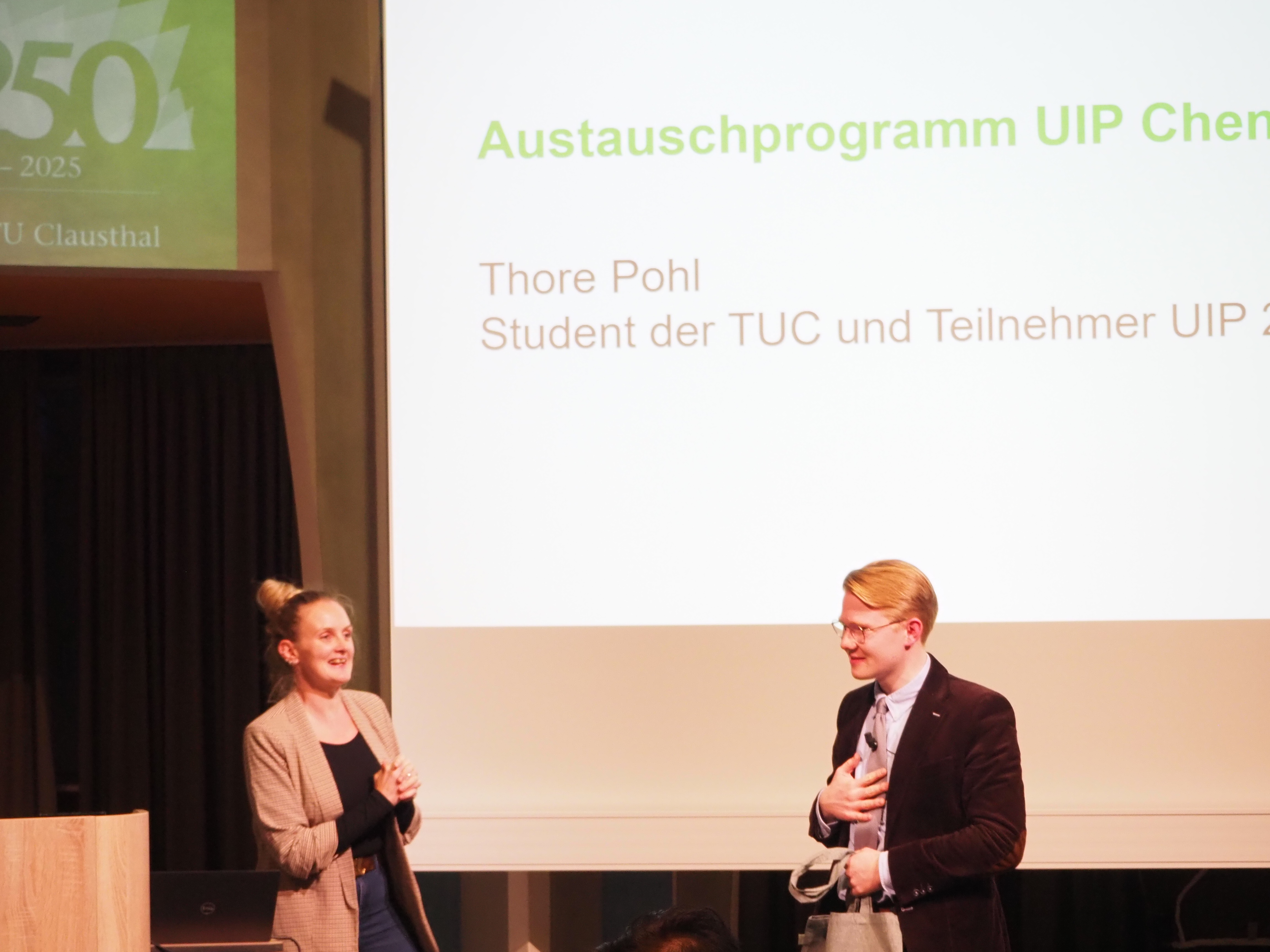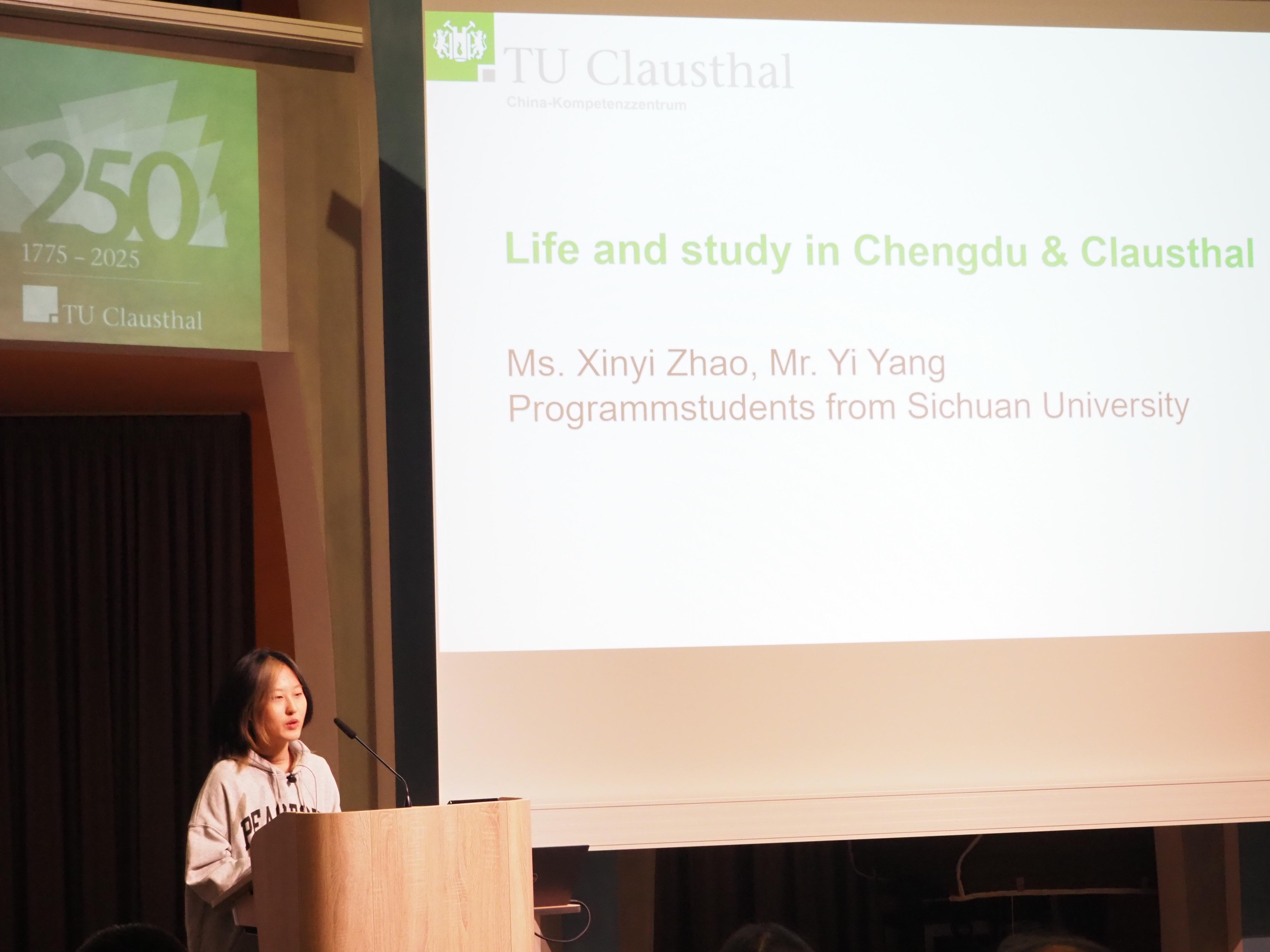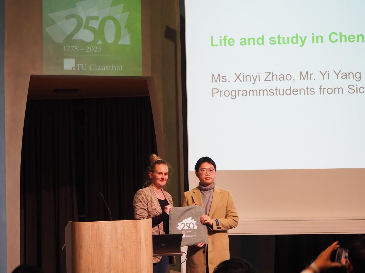 永利集团3044am中德班2021级学生赵欣怡和2022级学生杨毅作为学生代表分别以“A Year of Growth and Discovery in Clausthal(在克劳斯塔尔成长与探索的一年)”和“Leben und Studium in Chengdu und Clausthal(在成都和克劳斯塔尔的生活和学习)”为主题作报告,从不同角度分享了他们在中德两校的学习与生活体验。