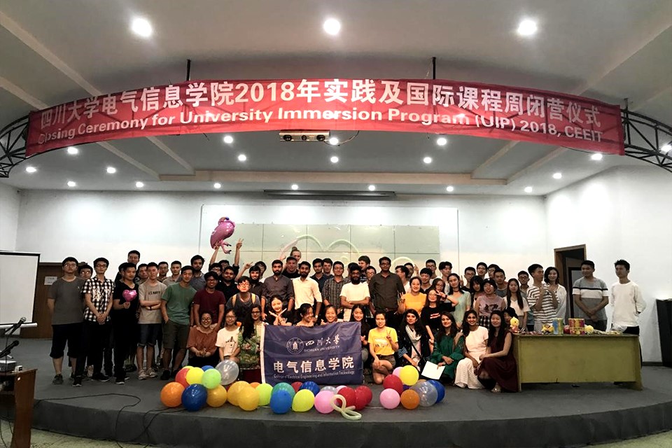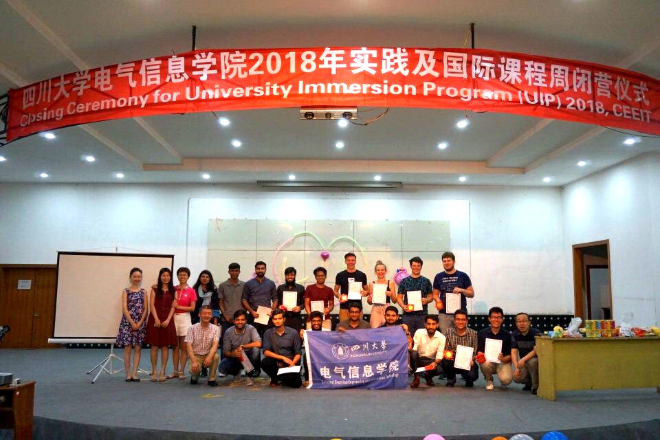 2018年7月19日晚上19:30,电气信息学院2018年国际课程周闭营仪式在望江校区学生活动中心举办。出席本次闭营仪式的有电气信息学院肖先勇院长、李长松副院长、王晓芳老师、邓清华老师、姜小雨老师以及国际交流营全体营员。