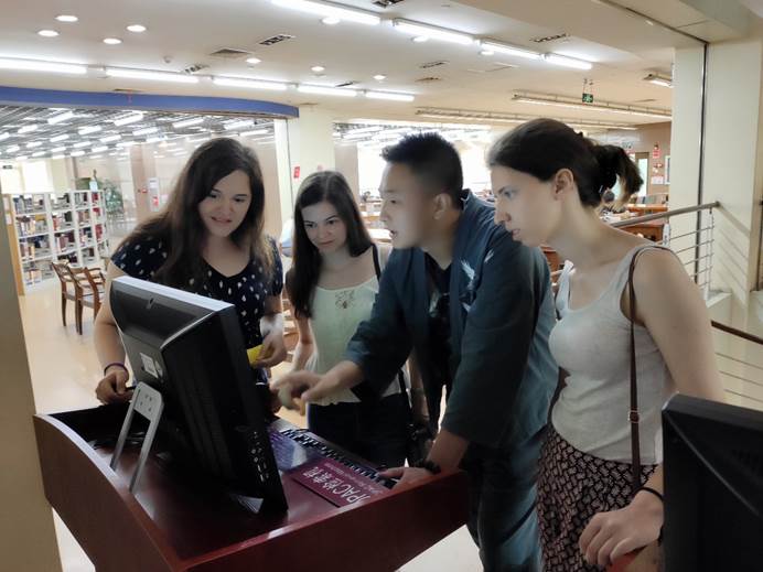 向留学生们介绍图书馆的设备