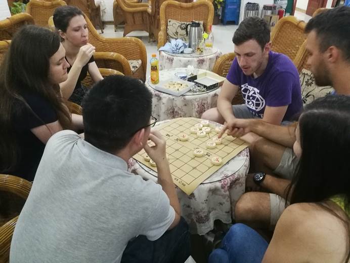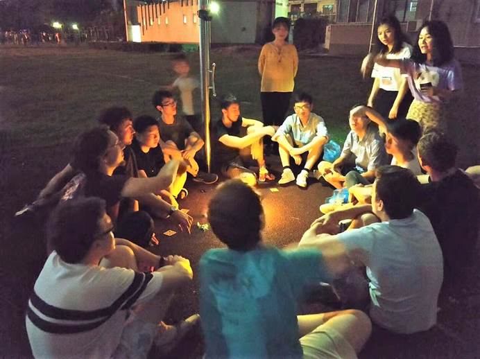 结束了白天的游览,大家在草坪上围成一圈,用妙趣横生的小游戏开启了轻松闲适的傍晚时光。大家玩起了歌曲接龙游戏,中国学生首先开口活跃气氛,大家跟着悦耳的歌声打起了节拍。留学生们跟着中国学生的旋律节拍也唱起歌谣,音乐跨越了语言限制,联结了不同的文化,在中外学生之间架起了沟通的桥梁。