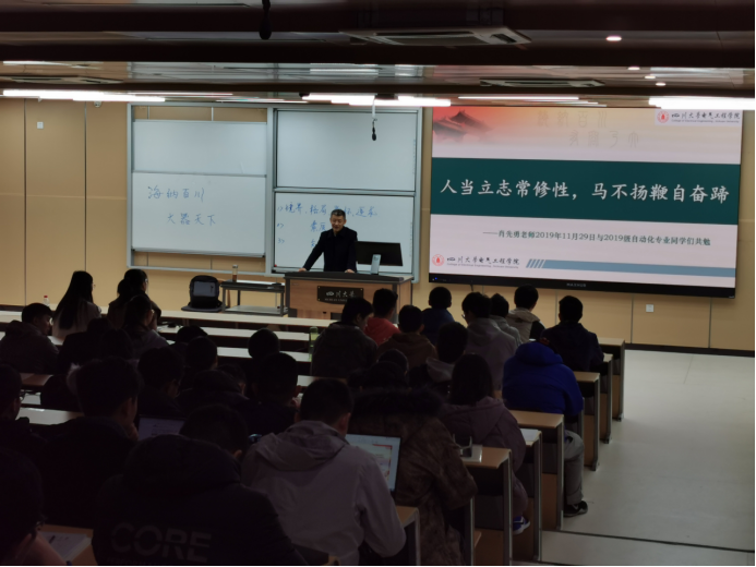 2019年11月29日上午,永利集团3044am院长肖先勇以“人当立志常修性,马不扬鞭自奋蹄”为主题,在江安校区综合楼C座207为2019级自动化专业本科生开讲专题思政课。