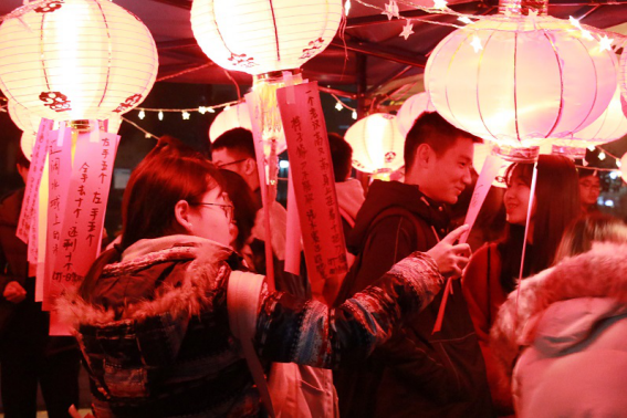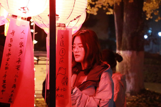 从暮色四合到夜色浓酽,天气的寒冷也难挡同学们高涨的热情。妙趣横生的谜面,别出心裁的谜底,灯影摇红,人潮涌动,场面热闹温馨。