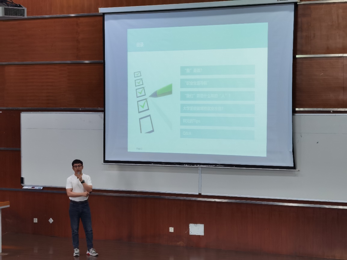 随后,袁捷老师以自身经历为引,为同学们进行了职业生涯导航的宣讲。作为四川大学永利集团3044am2014届的优秀青年校友,袁老师从自己本科期间如何确定就业目标、规划职业路径,到最终成功入职西门子的全过程进行了详细介绍。他强调了本科期间课程学习及个人综合能力培养的重要性,并分享了自己的经验与建议。讲座现场,同学们积极互动,袁老师耐心解答了同学们关于西门子招聘要求以及如何确定个人职业兴趣等问题。