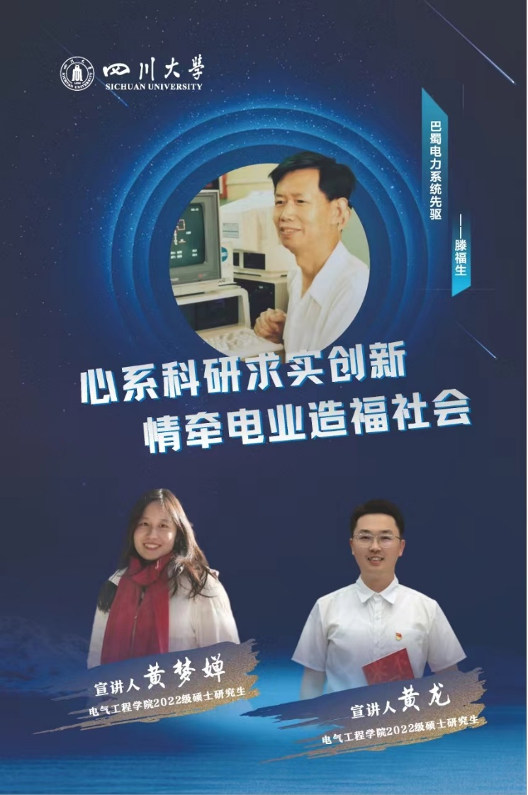 自四川大学“我是川大研究生 科学家精神大家谈”主题征文暨宣讲展示开展以来,我院积极响应,挖掘学院科学家们先进事迹,提交征文数篇。经过学院、学校层层筛选,2022级硕士研究生尹麒所撰写展示我院滕福生先生科学家精神风貌的《仰先生风范,感吾辈使命》最终入围宣讲展示作品;2022级硕士研究生黄龙、黄梦婵作为全校八组代表之一,声情并茂讲述了滕先生作为我院电气工程学科重要学术带头人,积极弘扬科学家精神和培育校园科学文化的奋斗故事。