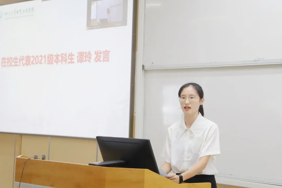 2021级电气工程及其自动化专业本科生谭玲作为在校生代表发言。谭玲向新入学的学弟学妹们表示祝贺,并分享了她的大学成长心得。她表示,大学生活需要适应、探索和交流。她鼓励新生们积极面对挑战,合理规划时间,夯实专业基础,并勇于探索未知领域。同时,她提倡广交朋友,保持开放心态,利用学校资源实现自我发展。谭玲的发言激励了在场的新生们,为他们的大学生活指明了方向。