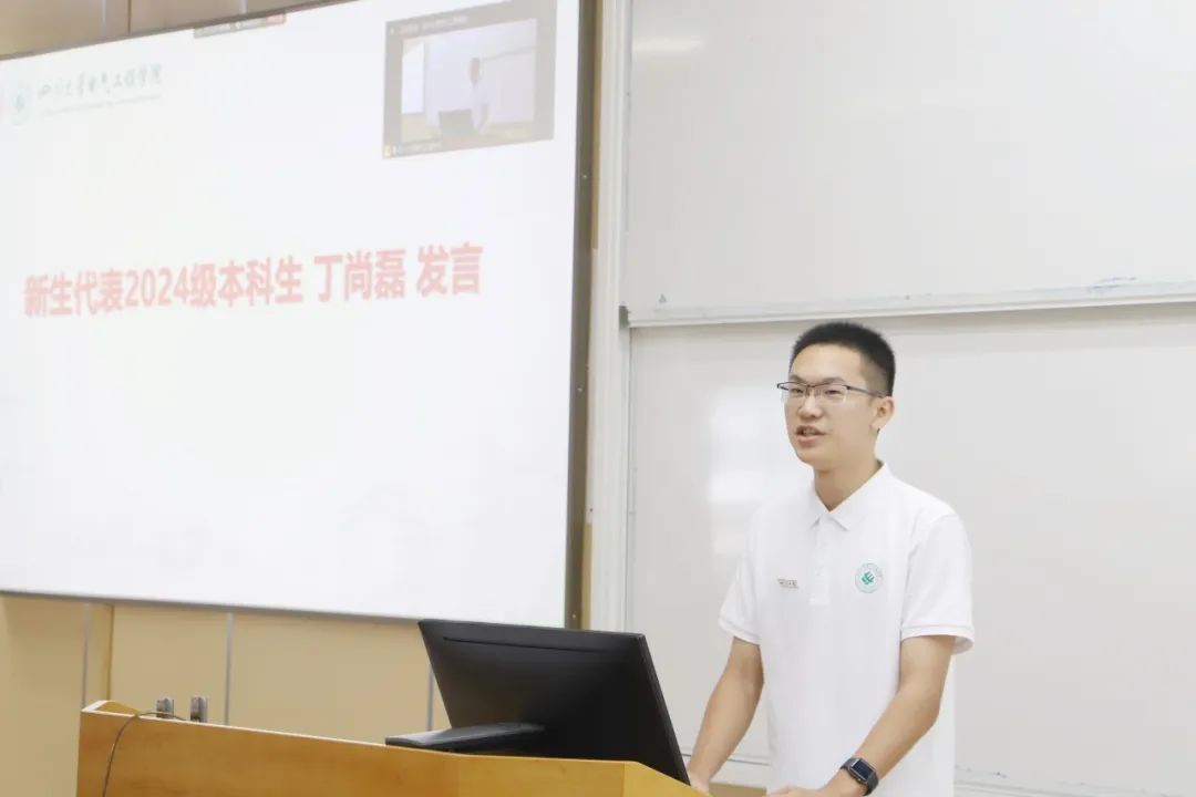 2024级新生丁尚磊作为新生代表发言。他首先回顾了初入川大的美好瞬间,并向为迎新付出努力的师生表示感激;又以奶奶干农活的经历为喻,激励新生们要勇于面对未来的学习与生活挑战,坚持不懈地追求卓越。丁尚磊表示,在川大,同学们将享有优质教育资源,与名师交流,与同窗共进。面对挑战,同学们应秉承“海纳百川,有容乃大”的校训,弘扬“严谨、勤奋、求是、创新”校风,勇攀学术高峰。最后,丁尚磊以毛泽东主席的名言作结,鼓励同学们成为时代先锋,为川大发展、国家复兴贡献力量。