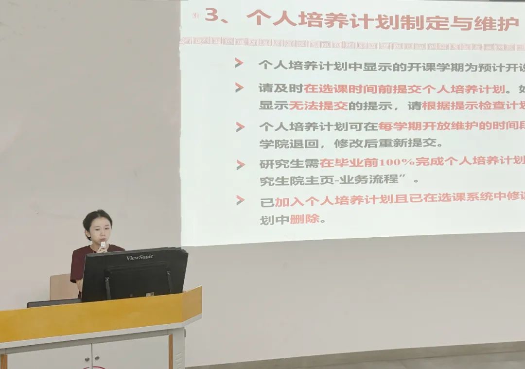 9月12日下午,学院研究生科何佳蔚老师作研究生培养方案讲解,具体针对研究生新生的个人培养计划制定与维护、选课安排以及培养方案解读进行了详细阐述。何佳蔚老师表示,个人培养计划是研究生阶段的重要指南,要求每位新生结合自身的学术兴趣和未来发展方向,与导师充分沟通,合理规划课程学习与科研任务。同时,对课程选修的流程与注意事项作了具体说明,帮助新生们更好地了解和把握学习进程,为未来的学术生涯打下坚实基础。