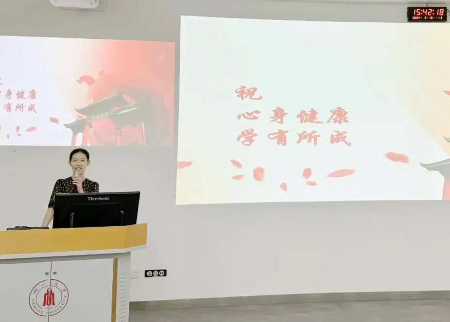 四川大学心理健康教育中心王瑾一老师在心理健康教育讲座中围绕“带着未知前进”、“带着希望等待”两方面展开,旨在帮助新生们提升心理韧性,顺利适应研究生阶段的挑战。王老师介绍了学校提供的心理支持资源,提供了应对压力的有效策略,鼓励大家在遇到心理困扰时及时寻求帮助,助力同学们在未来的学术和生活中保持身心健康。