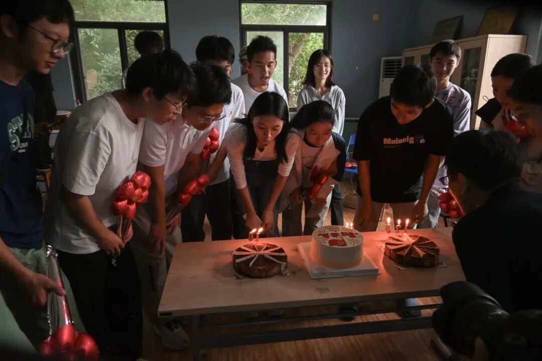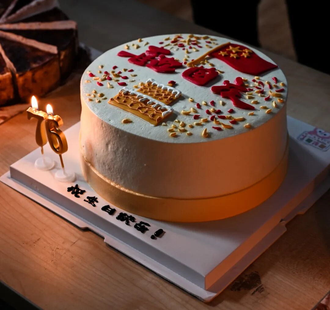 随后,现场点亮蜡烛,全体师生围站在一起,共同为祖国、学校以及过生日的同学唱响生日歌。歌声结束后,过生日的同学闭上眼睛默默许愿,吹灭蜡烛,并在师生的注视下切开象征团圆与祝福的生日蛋糕。赵书记则亲手为同学们分发准备好的礼物。