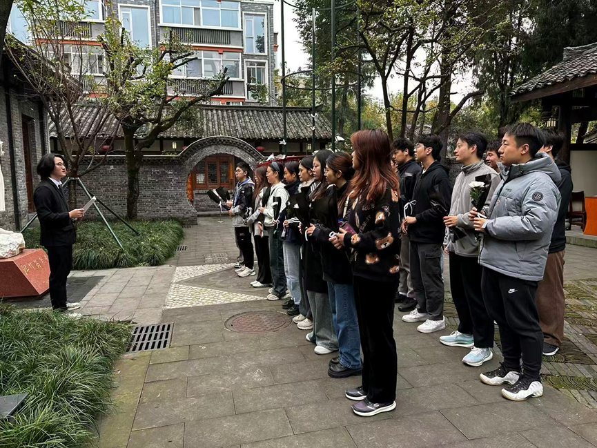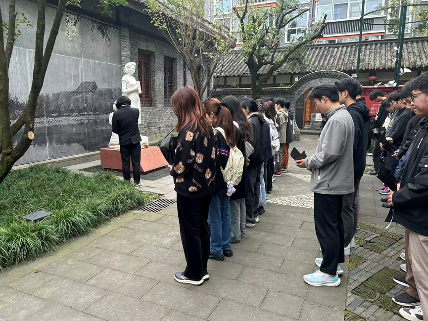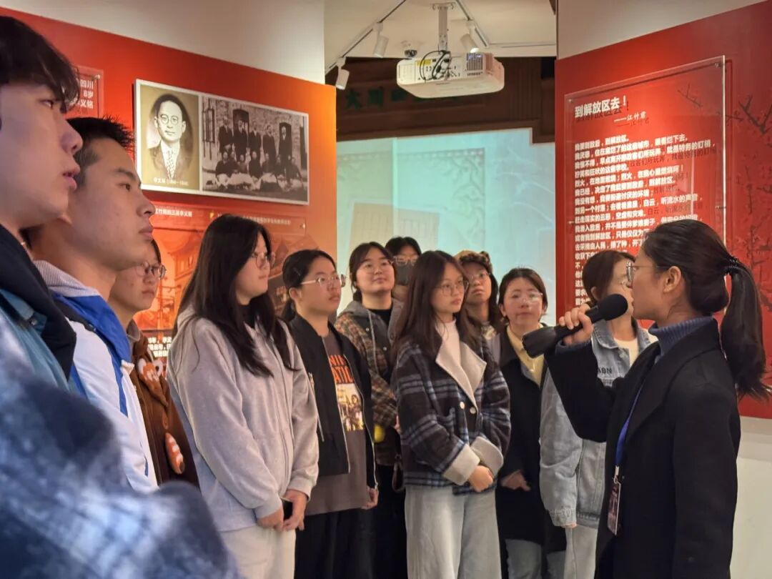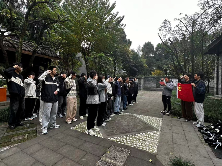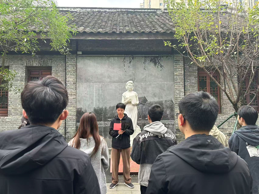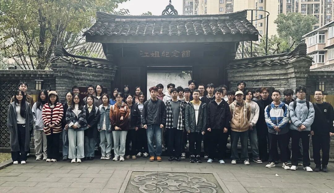 我们为纪念而来、为担当而来——把缅怀化作行动,把敬仰落到日常。参观结束后,2023级102102班班长曹瑜恒在江姐塑像前带领全体重温入团誓词,号召同学们“珍惜当下、勇担时代责任,把爱国之情化为报国之行”。在活动尾声,同学们手持班旗、团旗在馆前合影,高呼“缅怀英烈,强国有我”,以青春之声回应时代之问。