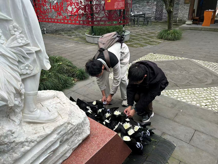 全体同学着深色上衣、有序入馆,于江姐英烈塑像前肃立集结,齐唱国歌、默哀一分钟,以无声的敬意追思革命先烈的坚定与无畏。