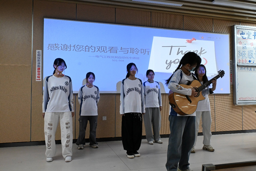 活动过程中,穿插着一系列趣味小游戏,现场氛围热烈活跃。展示环节结束后,评委与在场观众共同参与现场投票评审。值得一提的是,此前在迎新晚会期间,本活动已通过线上平台发起了前期大众投票环节,广泛吸引了全院同学的关注与参与,为各班设计作品积累了人气与支持。最终,301302班斩获一等奖,111307班取得二等奖,101102班获得三等奖。每个班的设计不仅展现了同学们对电气知识的深入理解与热爱,更通过服饰这一创意载体,生动传递出青春积极的精神风貌。