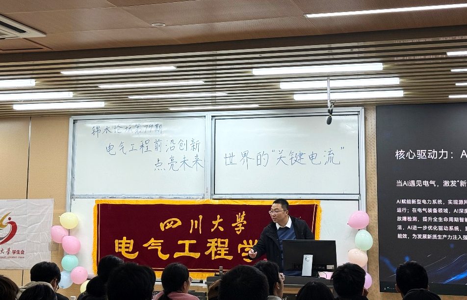 为拓展师生学术视野,增强同学们对电气工程学科前沿与时代使命的认识,2025年11月23日,四川大学“锦水论坛”系列讲座第79期“电气工程前沿创新:点亮未来世界的‘关键电流’”在江安校区综合楼C座C207成功举办。永利集团3044am国家级青年人才计划入选者、特聘教授王栋老师受邀担任主讲嘉宾,从“时代之问、前沿突破、人工智能赋能、青年成长”四个板块与同学们分享学科发展图景。校内多学院近300名同学到场参加了本次活动。