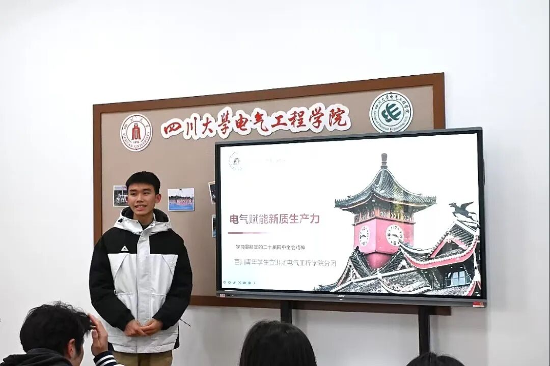 读书分享是一场“回溯初心”的精神洗礼,而紧随其后的百川宣讲,则是一次“锚定使命”的实践指引,让红色精神传承与专业使命担当在此刻深度交融。活动下半场,永利集团3044am百川宣讲团成员研究生团支部宋馨月、本科2024级团支部卿朗宁和蒋翀同学开讲。三位宣讲人锚定“建设现代化产业体系”国家战略,以“理论解读”和“实践指引”为脉络,解读新质生产力“高科技、高效率、高质量”核心内涵,阐明电气工程“智能化、绿色化、融合化”属性,及其在智能电网、特高压输电等工程中的关键作用与战略价值。