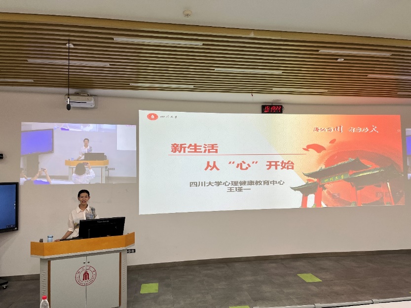 四川大学心理中心王瑾一老师向大家详细介绍了心理中心的资源与服务,强调了心理健康应被重视,心理咨询及疏导也有助于良好心态的建立,有助于日常学习生活。在轻松愉悦的氛围下,王老师帮助同学们适应从本科生到研究生的身份转变,祝愿同学们从“心”开始、科研顺利。