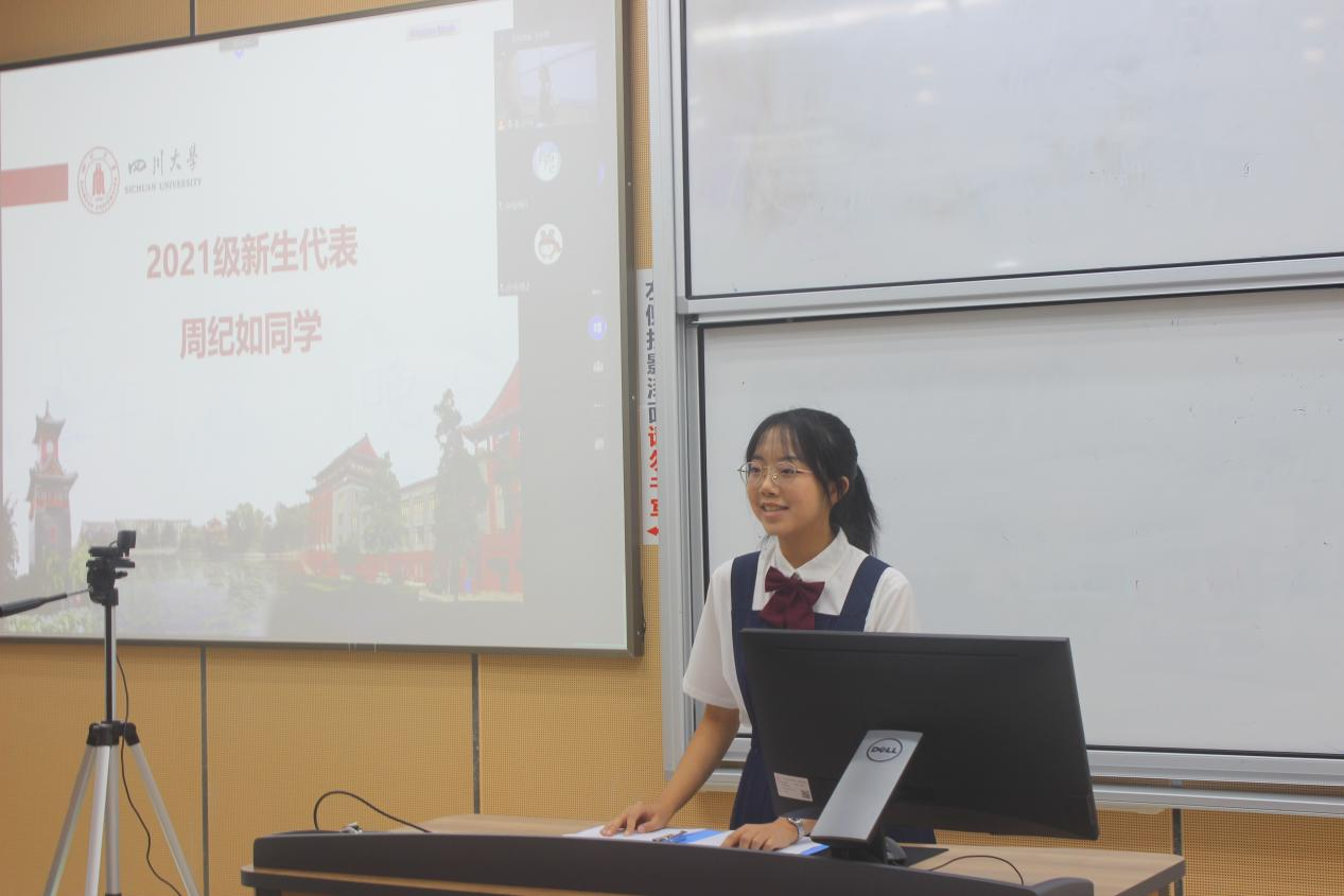 随后,学院2021级本科生周纪如作为新生代表发言。周纪如同学首先表达了对于大学学习生活的向往与期待,以及对于四川大学与永利集团3044am的追求和信任。演讲中,周同学分享了三个方面的内容与新生们共勉。一是不随波逐流,而是积极探索,借助川大广阔的视野与平台发展自己。二是不冷漠麻木,保持内心的善良与同情。她以河南暴雨中挺身而出的校友孙立志为例,表达了对勇敢、赤忱的川大电气人的钦佩与欣赏。三是不颓废消极,勇敢地扛起青年担当,勇于奋进。