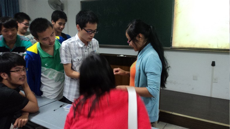 最后,技术部部长唐锋现场向新会员进行魔术教学,大家兴致浓浓地倾听学习,更有同学现场表演,虽然不太熟练,但仍乐在其中。