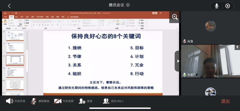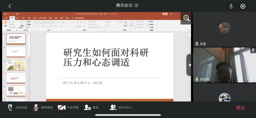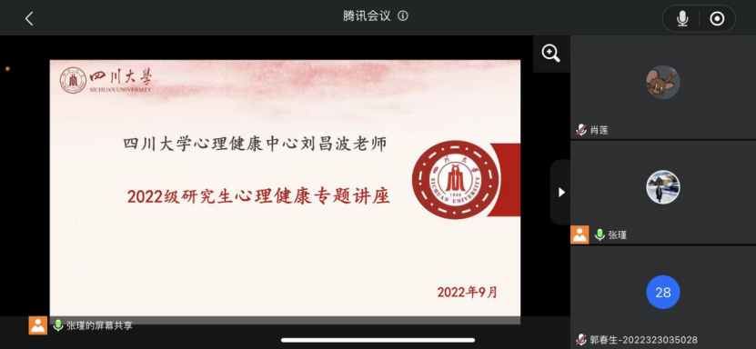 秋风送爽,金桂飘香,四川大学永利集团3044am迎来了2022级研究生新生。为了帮助研究生新生尽快适应研究生学习、科研、生活,提升研究生心理健康意识和心理调适能力,学院特邀四川大学心理健康中心刘昌波老师为我院2022级全体研究生新生做题为“研究生如何面对科研压力和心态调适”的心理健康讲座。2022年9月16日,讲座采用腾讯会议的线上形式顺利举行,永利集团3044am研究生辅导员张瑾老师主持,四川大学心理健康中心老师刘昌波应邀主讲,全院2022级研究生新生参加了本次讲座。