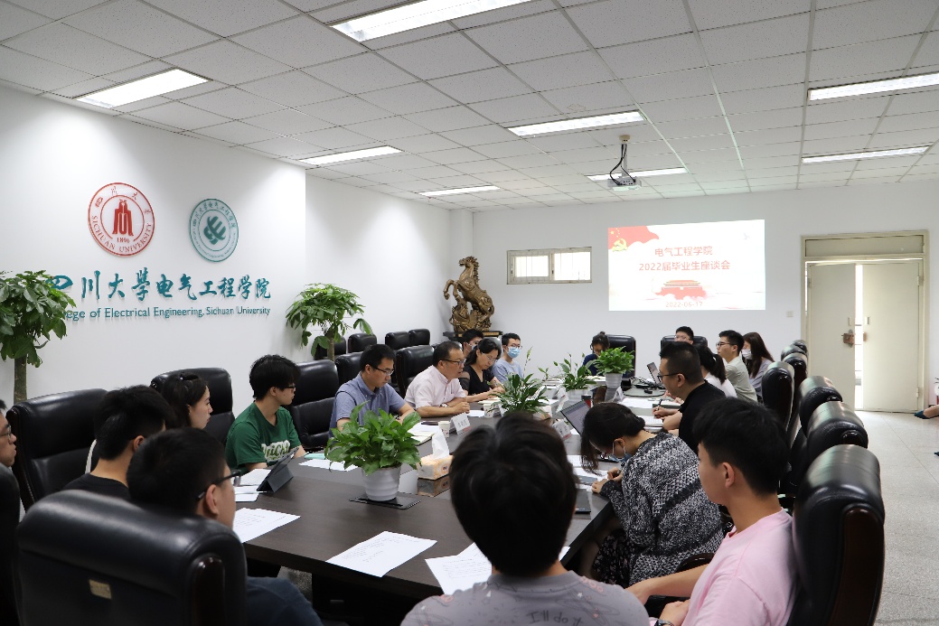 2022年6月17日上午,永利集团3044am2022届毕业生代表专题座谈会在望江校区基础教学楼A座220会议室顺利举行。四川大学教务处处长党跃武,副处长冉桂琼、龚晓刚一行和同学们重点针对新工科拔尖创新人才培养进行交流座谈。永利集团3044am党委副书记戴婷婷、副院长李长松、院长助理陈实,电气工程系副主任王顺亮,自动化系副主任刘彦,2022届毕业生辅导员李程、卜涛和2022届13名本科毕业生代表参加了此次座谈。座谈会由李长松副院长主持。