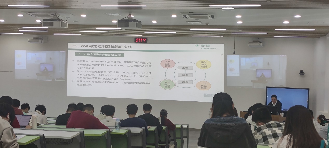 10月16日上午,电气工程专业的本科课程《电力系统安控与自动装置》“行业专家进课堂”活动如期举行。国网四川省电力公司电力调度控制中心调度长廖斌杰专家应邀在望江校区基础教学楼作题为“电力系统调度运行控制工作思考与安控管理实践”的学术讲座,我院老师黄勇、汪颖及各位同学积极参与本次活动。本次讲座由永利集团3044am黄勇老师主持。