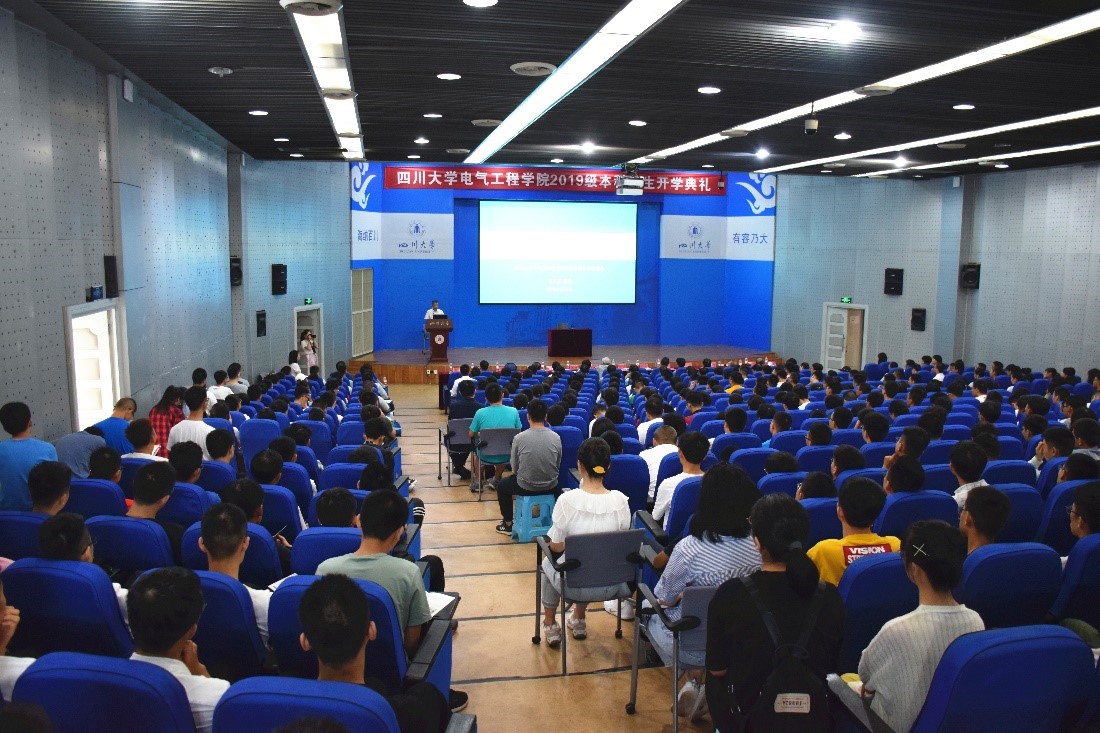 时维九月,微风和煦。2019年9月1日,永利集团3044am2019级本科新生开学典礼在江安校区水上报告厅隆重举行。中国工程院院士雷清泉教授、学院党委书记韩芳、院长肖先勇、学院党委副书记兼纪委书记张英敏、学院党委副书记戴婷婷、副院长李长松、院长助理李成鑫、电气工程系主任王渝红、副主任曾成碧、电气工程系第一党支部书记赵莉华、副书记刘亚梅、自动化系主任佃松宜、副主任曾晓东、自动化系党支部书记刘念、电工电子基础教学实验中心主任周群、电工电子基础教学实验中心党支部书记梁斌、专业实验中心主任肖勇、专业实验中心党支部书记冉立等院系领导,博士生导师代表周凯、刘凯、王为老师,新生班主任邱晓燕等老师、学院教导员李小根老师、新生辅导员老师等出席了本次大会。大会由学院党委副书记戴婷婷主持。