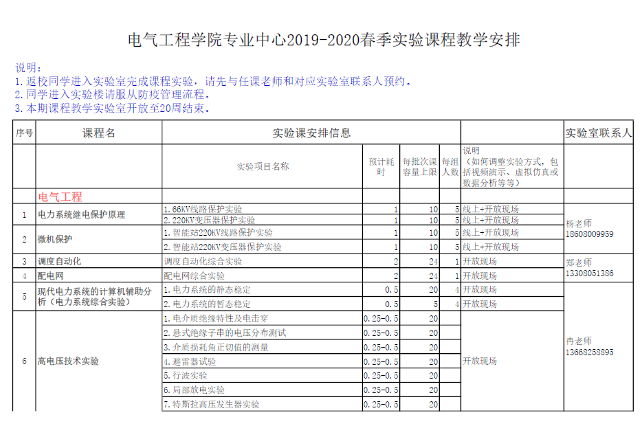 电气工程专业实验中心教学安排表(局部)