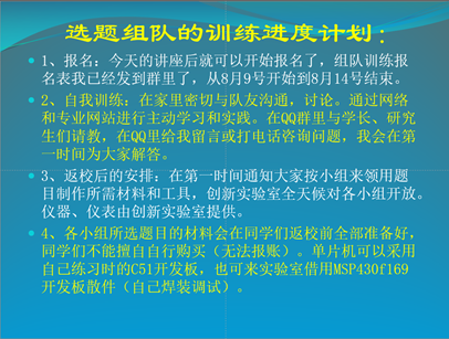 接着,李老师向同学们介绍如何选题与组队,以及如何在暑假期间进行自我训练。选题上,李老师建议可以从专业、兴趣、成员分组这些角度决定。组队方面,李老师提出了:“骨干—骨干”,“骨干—新队员”,“新队员—新队员”三种模式。完成组队之后,即可按照组内分工进行自我训练。