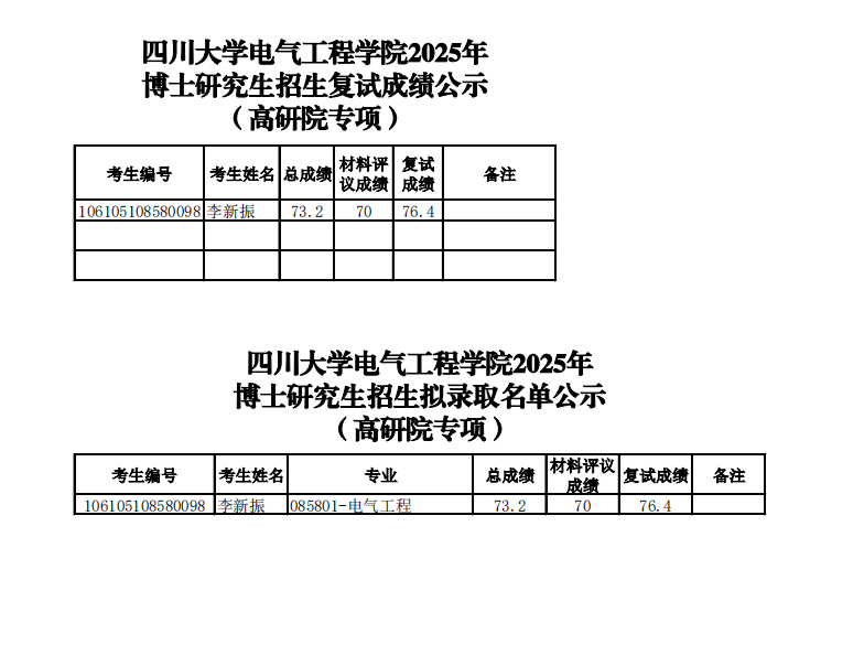 四川大学永利集团3044am2025年高等研究院专项计划博士研究生招生复试成绩、拟录取公示
