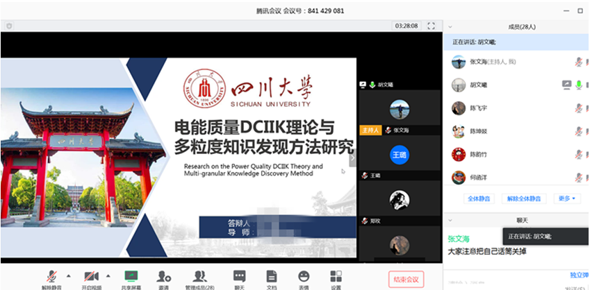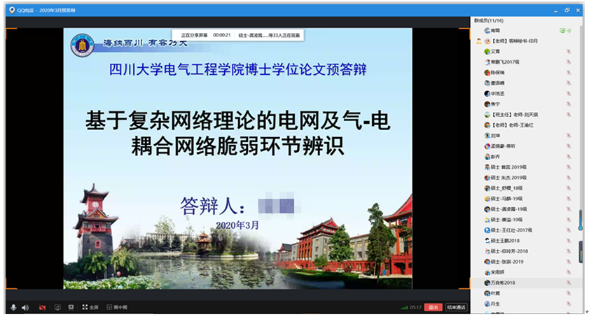 电能质量与优质供电研究团队肖先勇教授指导的5位博士研究生预答辩于3月14日下午2点举行,参与答辩的博士生虽然分布在全国各地,但通过视频会议在线演示学位论文PPT,博士生们与答辩委员会专家、旁听教师进行了实时交流。专家针对学位论文内容进行细致指导并提出具体修改建议。经过专家们线上无记名表决,5位博士生的学位论文顺利通过了预答辩,同意推荐进入匿名送审环节。电能质量与优质供电研究团队博硕士研究生在线参与旁听。