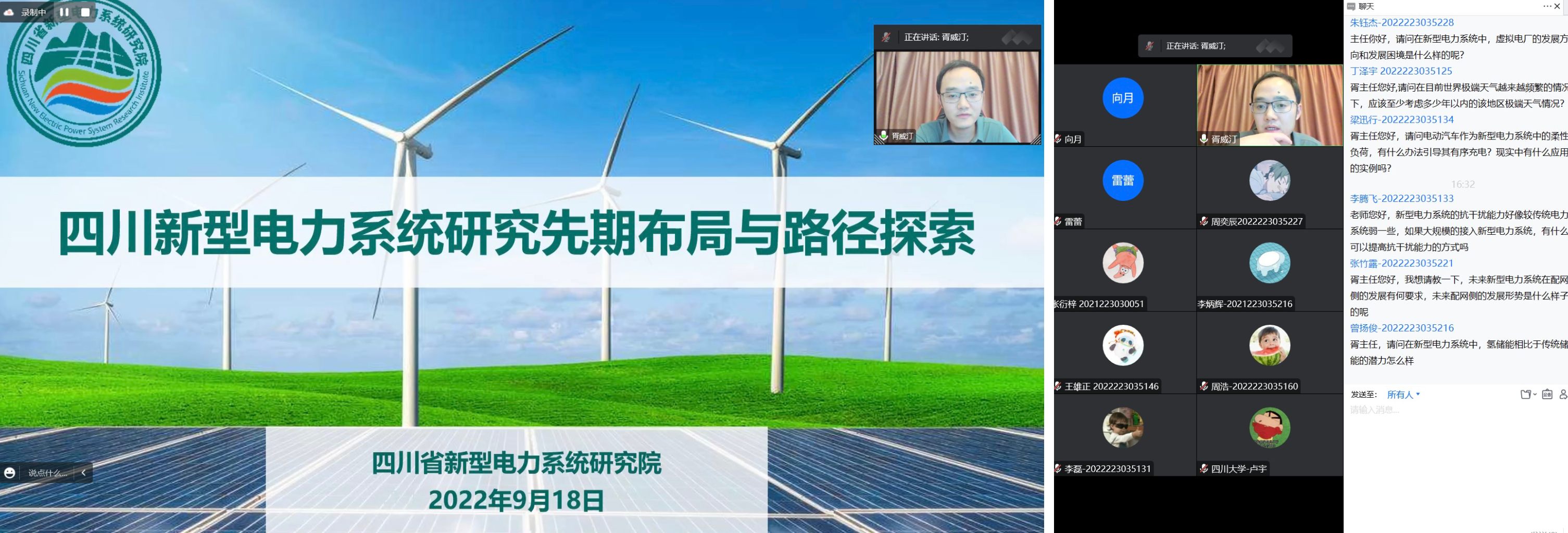 本期第一次课程邀请了四川大学企业导师、四川新型电力系统研究院胥威汀主任作了题为“四川新型电力系统研究先期布局与路径探索”的精彩专题讲座。讲座从新型电力系统的形式与背景、特征与内涵以及四川省新型电力系统建设三个方面展开,清晰介绍了电气工程学科新型电力系统发展前沿与四川实际需求,吸引了学院“本-硕-博”300余师生在线参与学习与互动。同学们将自己的疑惑和见解主动与胥主任展开交流与讨论,他表示同学们所提问题都很专业、很有水平,大家也表示通过此次讲座收获满满。