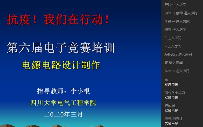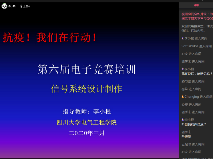 本次网络讲座分别利用2020年3月28-29日周末的课外活动时间根据竞赛题目的分类在四个QQ群里进行,由指导教师李小根老师主讲,分别包括电源类题目技术指导、自控设计培训、信号系统设计制作、智能车设计制作四个讲座。