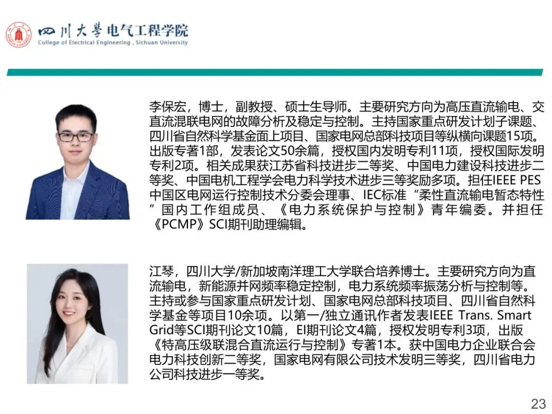 李保宏,博士,四川大学永利集团3044am副教授、硕士生导师。主要从事高压直流输电、交直流混联电网稳定与控制,柔性交流输电、新能源并网协调控制等领域研究。主持国家重点研发计划子课题、四川省自然科学基金面上项目、国家电网总部科技项目等纵横向课题15项。发表论文50余篇,授权国内发明专利11项,授权国际发明专利2项。获江苏省科技进步二等奖、中国电力建设科技进步二等奖、江苏省电机工程学会科技进步一等奖等奖励多项。担任IEEE PES中国区电网运行控制技术分委会理事、IEC标准“柔性直流输电暂态特性”国内工作组成员、SCI期刊《Electronics》、《PCMP》等多本期刊编辑。