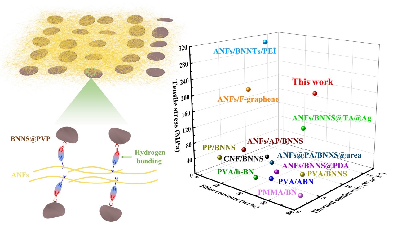 近日,任俊文等人从多维纳尺度基元微界面工程出发,利用聚乙烯吡咯烷酮(PVP)对高导热填料(BNNS)进行非共价改性,优化了BNNS在芳纶纳米纤维(ANF)网络结构中的分散特性,进一步通过真空辅助抽滤结合热压工艺,成功制备出了具有规整结构的ANF/BNNS@PVP复合绝缘纸。PVP与ANF之间的强界面氢键作用以及规整的砖-泥结构,优化了声子在复合绝缘纸中的传输特性,提升了应力传递和电荷耗散,赋予复合绝缘纸超高热导率(~14.5 W m-1K-1)、优异的力学强度(~184 MPa)和击穿强度(~274 kV mm-1)。相关成果以题为“Highly thermoconductive and mechanically robust boron nitride/aramid composite dielectric films from non-covalent interfacial engineering” (DOI:10.1007/s42114-023-00816-z)发表在国际知名期刊《Advanced Composites and Hybrid Materials》(最新影响因子23.2),并成功入选ESI高被引论文(Highly Cited Paper)以及ESI热点论文(Hot Papers)。