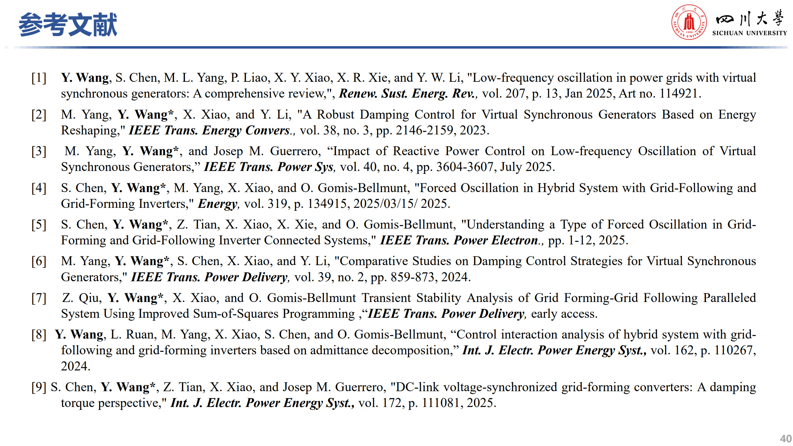 王杨,四川大学研究员、博士生导师,获电力优秀青年科技人才奖、四川省杰出青年基金、四川省天府峨眉计划、IEEE PES 输配电技术委员会(中国)杰出成就奖,任IEEE Trans. on Power Delivery、MPCE等7本期刊编委。主要从事电能质量、新能源并网稳定性分析与控制等方面研究。主持国家自然科学基金项目3项、国重子课题2项,以第一/通信发表高水平论文50余篇,其中IEEE PES Trans 31篇,ESI高被引4篇。获中国电力科技进步二等奖(第1)、中国电力创新奖一等奖(第1)、四川省/山西省科技进步奖一等奖(第3)。