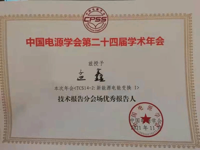 学院孟鑫老师受邀作题为《一种具有高电能质量的大功率高效电解质制氢整流电源》的报告,并获“技术报告分会场优秀报告人”奖;王学庆老师受邀作题为《多相组交流永磁电机系统功率变换与调控方法》的专题讲座;此外,周群、贺明智、刘雪山、周述晗等老师通过论文投稿的方式参加了会议。