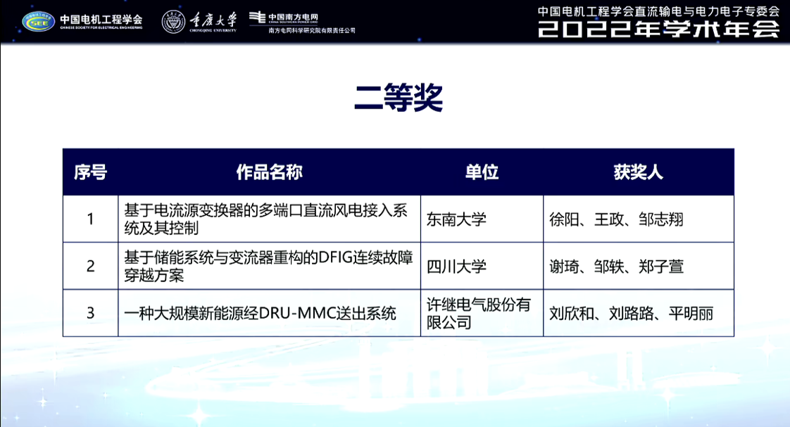 本次年会还为“第八届直流输电与电力电子创新杯大赛”的获奖作品举行了颁奖仪式,本次大赛共评选出一等奖2项、二等奖3项、优秀奖2项,我院谢琦、邹轶、郑子萱的参赛作品“基于储能系统与变流器重构的DFIG连续故障穿越方案”获得了二等奖。在高比例新能源交直流混联送端电网中,换相失败等直流故障引发的“先低后高”连续暂态电压扰动给双馈风电机组安全运行带来严峻挑战。针对现有故障穿越策略在连续扰动下适应性不足的缺点,项目组在分析连续扰动形成机理及其对DFIG影响的基础上,提出了基于储能系统与变流器重构的连续故障穿越方案,在电网侧故障期间重构风机并网换流器拓扑,主动利用储能系统与网侧变流器的调节能力维持双馈风机定子电压和内部关键电气量稳定,实现故障穿越与可靠并网。与现有故障穿越策略相比,在故障穿越能力、经济性、可扩展性等方面均具有显著优势。
