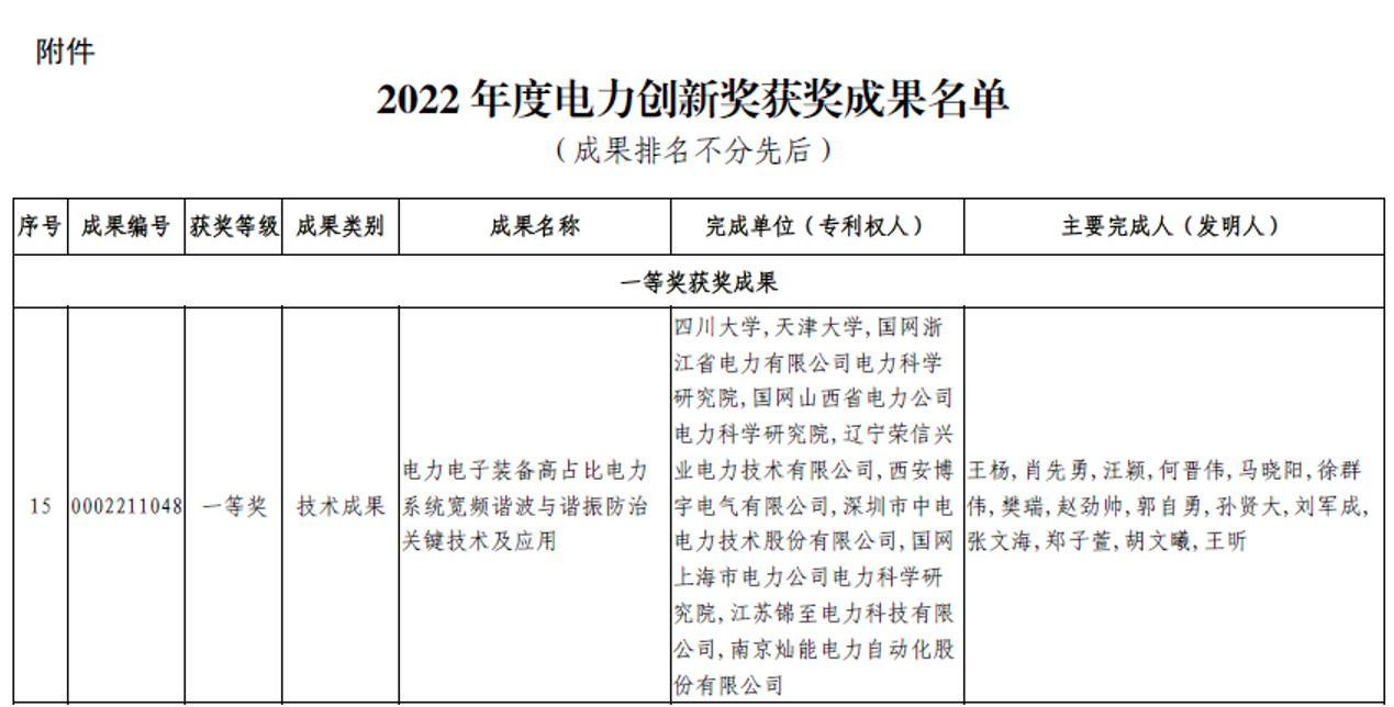 近日,中国电力企业联合会公布了2022年电力科技创新奖获奖名单,我院电能质量与优质供电团队牵头的“电力电子装备高占比电力系统宽频谐波与谐振防治关键技术及应用”荣获中国电力科技创新奖一等奖。该项目第一完成单位为四川大学,主要完成人包括肖先勇教授、王杨研究员、汪颖教授、马晓阳副教授、赵劲帅助理研究员等,合作单位包括天津大学、国网浙江电科院、国网山西电科院、辽宁荣信等单位。
